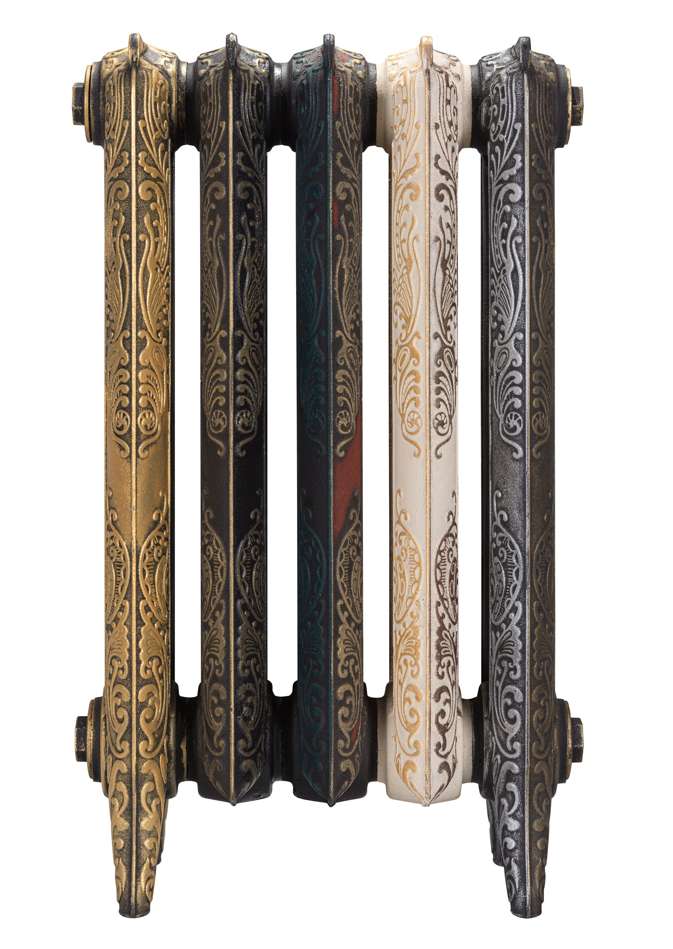 Окрашиваются термостойкой эмалью. Разнообразие цветовой гаммы представлено в каталоге RAL и включает в себя несколько тысяч цветов и оттенков. Идеально подчеркнут красоту радиатора оттенки золота, бронзы и серебра. Возможны различные эффекты патинации ( благородного состаривания). Работа производится на профессиональном оборудовании, с помощью которого наносятся специальные термостойкие красители, придающие радиаторам неповторимый внешний вид.